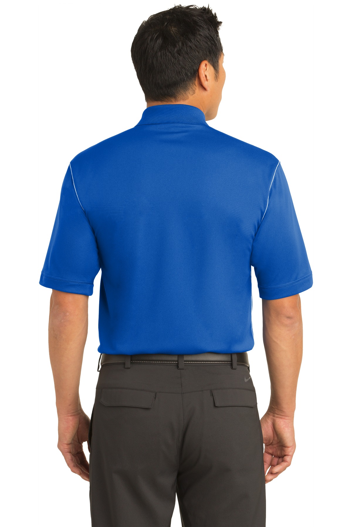 Switch up your solids with this contrast stitch style while staying dry through heated rounds with Dri-FIT moisture management technology. Design details include a flat knit collar pearlized buttons and open hem sleeves. Features a three-button placket and side vents. The contrast Swoosh design trademark is embroidered on the right chest. Made of 5.6-ounce 100% polyester Dri-FIT fabric.