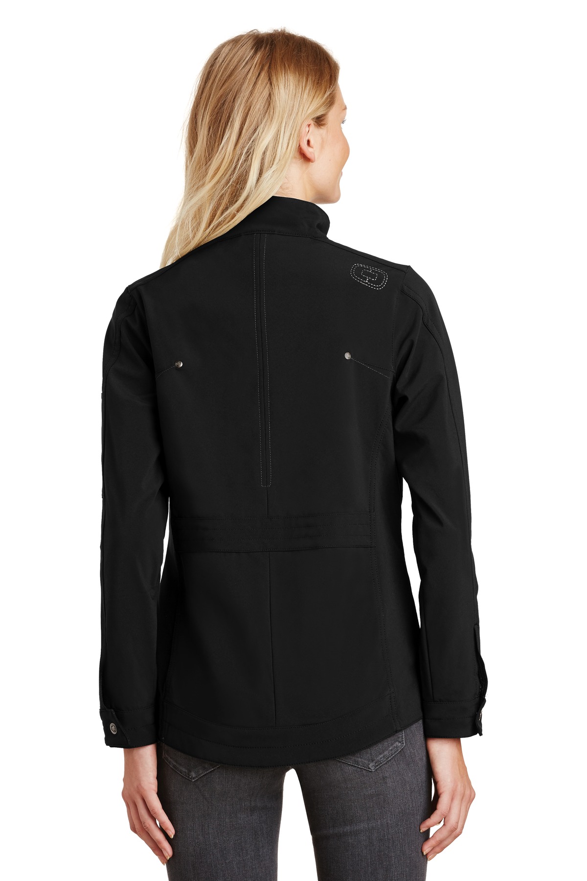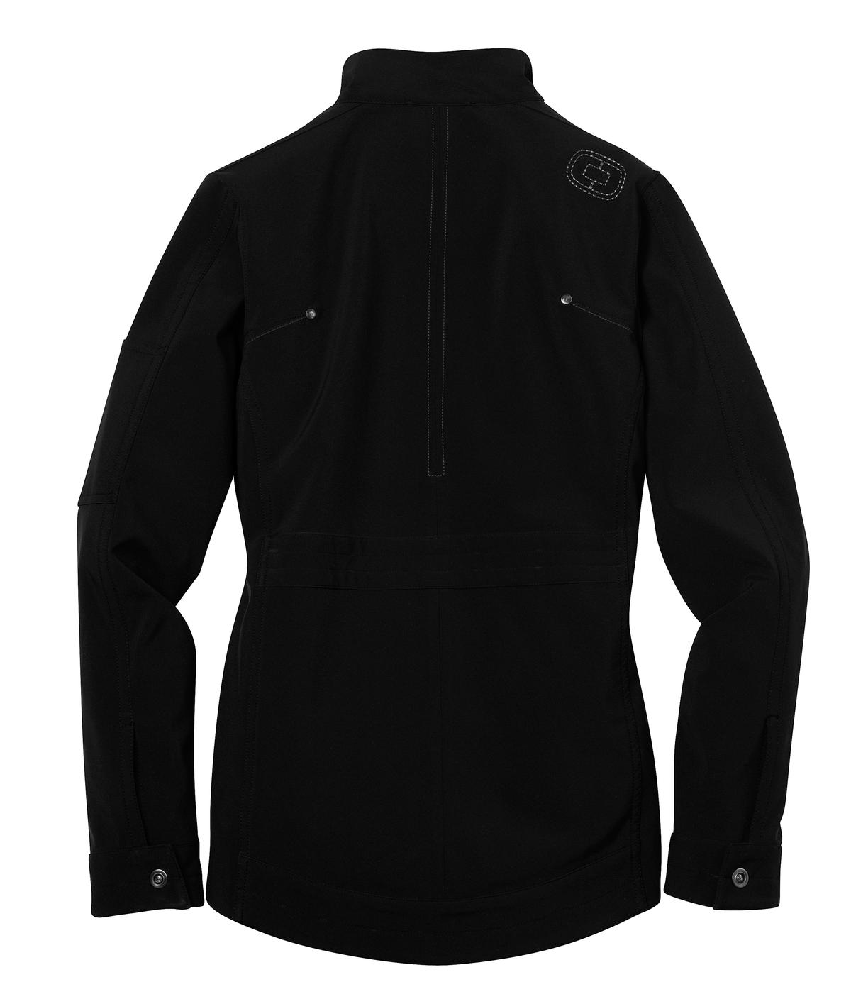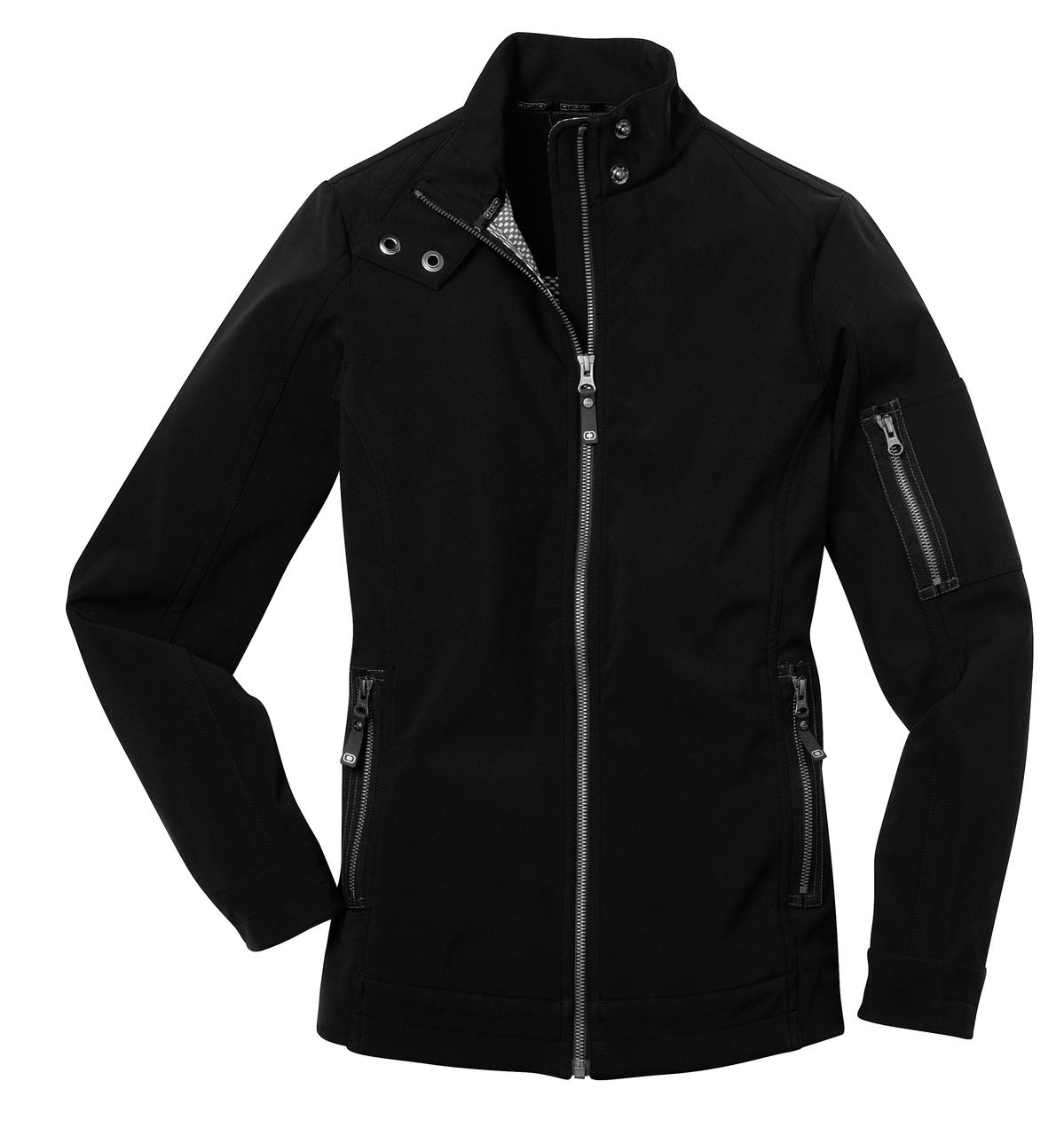 This high-performance jacket has clean lines and an edgy yet feminine look that's all OGIO. 3K/3K fabric for very good water protection and breathability. 100% poly stretch shell bonded to poly mesh with a laminated film insert for wind and water resistance 3000MM fabric waterproof rating 3000G/M fabric breathability rating OGIO heat transfer label for tag free comfort Locker loop Cadet collar with metal logo snap closure OGIO rivets on back shoulders and contrast stitched O embroidered on back right shoulder Metalux zipper with rubber OGIO zipper pull Left sleeve zippered pocket Front zippered pockets with rubber OGIO zipper pulls Open cuffs with metal logo snap closures Open hem