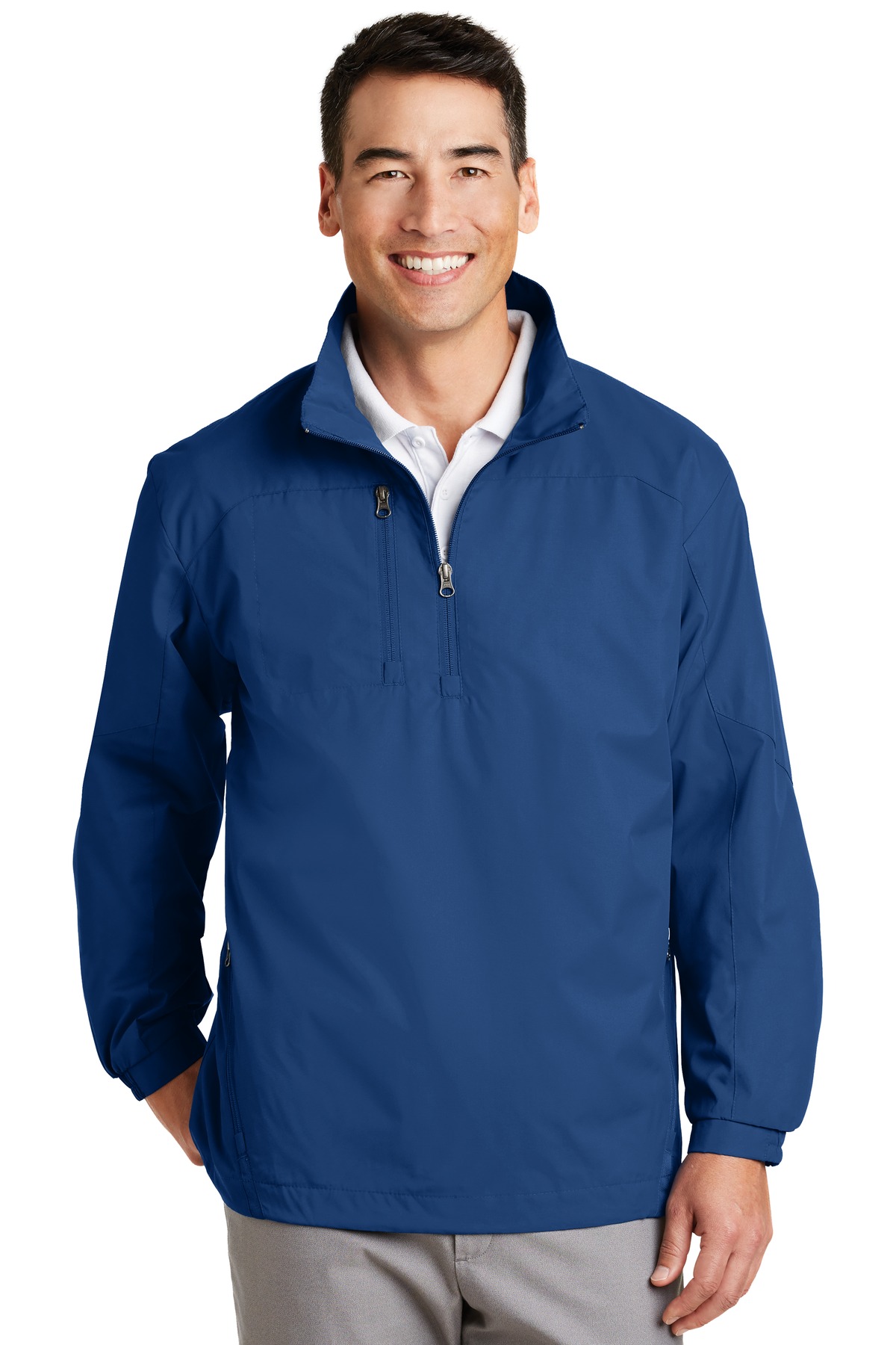 Wind and rain won’t keep you out of the game in our 1/2-Zip Wind Jacket. Lightweight and soft this comfortable jacket resists the elements and won’t hinder your swing thanks to its full cut and articulated elbows.100% polyester shell with PU coating 100% polyester lining throughout Triple-needle stitching on shoulders and back yoke Half elastic half self-fabric cuffs for comfort Side zippered pockets Zippered chest pocket Left side seam zipper for easy on/off Open hem with drawcord and toggles for adjustability